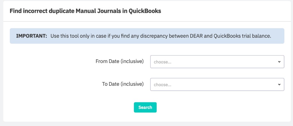 This tool should only be used in the case of finding discrepancies between Cin7 Core and QuickBooks Online trial balance. Enter a To Date and From Date and click Search to find all manual journals in QuickBooks for the period. Compare journal entries that were created or not created from Cin7 Core to try to find journals that were created by Cin7 Core as duplicates.