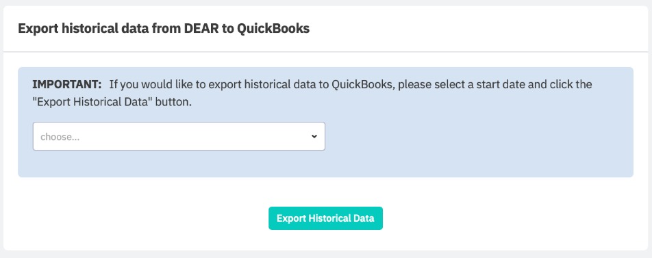 You can export historical data from Cin7 Core to QuickBooks Online, which registers all documents and related items (products, vendors, customers, etc.). Use this feature to export all data to QuickBooks Online for a particular date range. To start the export process, select a start date and then click the Export Historical Data button.
