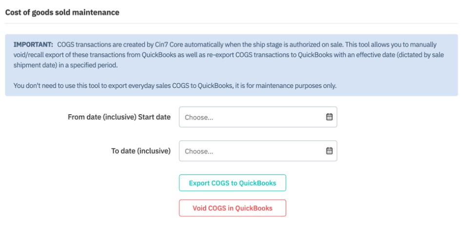 You can manually export COGS transactions, or void (recall) previous exports, for a specific date range using the Cost of Goods Sold Maintenance section. Specify the period you want to adjust (the selected dates are included in the period), then click either the Export COGS to QuickBooks or Void COGS in QuickBooks button, depending on the action you're taking.