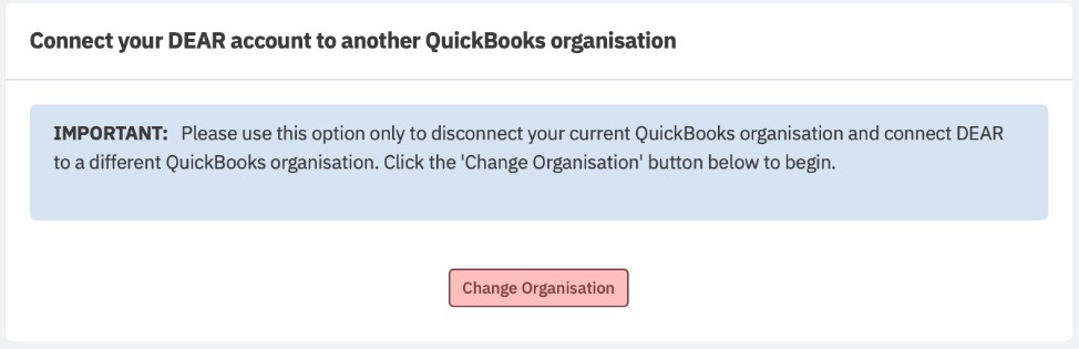 If you decide to connect Cin7 Core to a different QuickBooks Online organization, click the Change Organisation button. You will be walked through the QuickBooks Connect Wizard to finish account and tax mapping. This is essentially the same process as connecting to QuickBooks for the first time.
