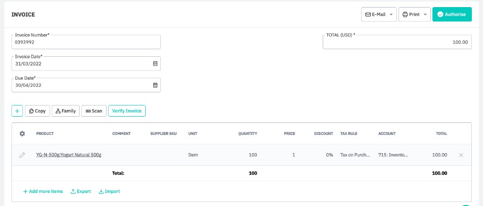 When the finished goods are received from the co-manufacturer, enter the Stock Received in the purchase order and Authorize the stock received. Invoice quantity can not be edited after stock has been received.