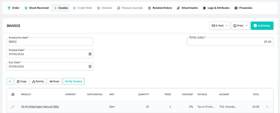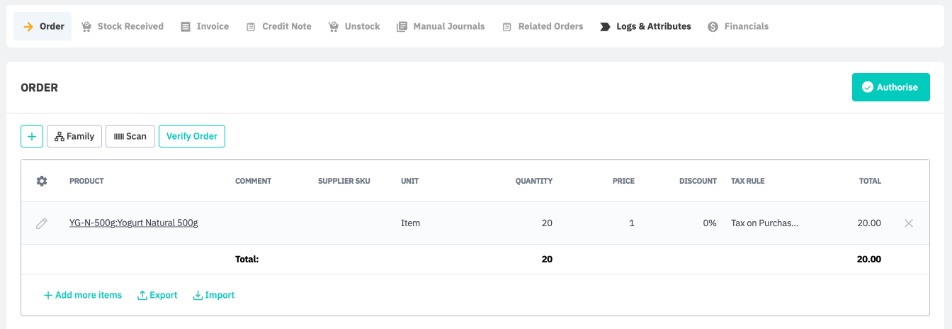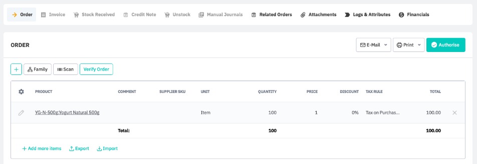 In this stage, we will walk you through some examples using this feature, for both simple and advanced purchases. The workflow shown is slightly different if your purchase order is processed invoice first or stock first - this order can be edited from the purchase process customisation settings if necessary.