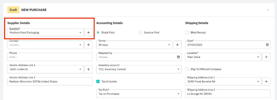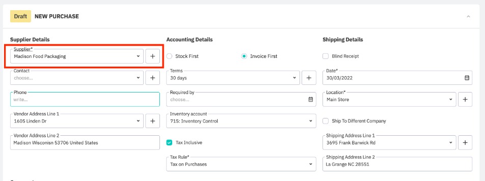 Our third example is for a advanced purchase processed with invoice first. The first step is to create a purchase order for product, selecting the co-manufacturer as the supplier. You can start with Advanced Purchase, or start with a Simple Purchase and later convert this to an Advanced Purchase.