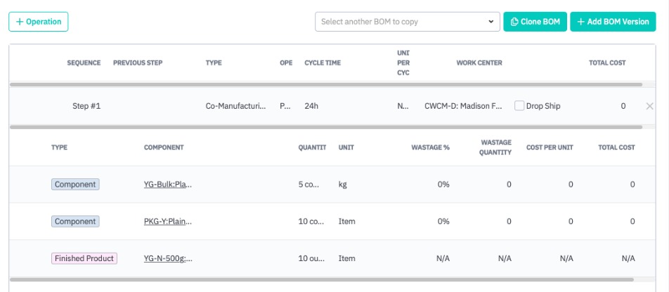 The merchant will however need to set up a co-manufacturing location, create a work centre and connect it with that location, and create a Production BOM containing a single co-manufacturing operation.