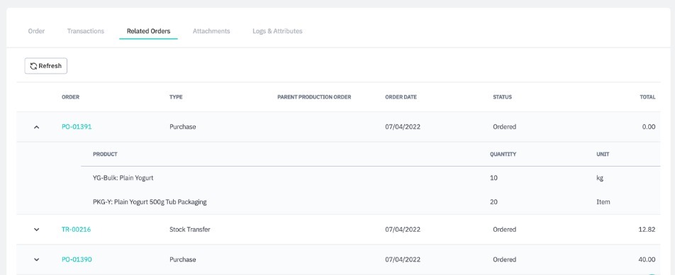 Note: You can view related orders at any time by going to the Related Orders tab of the co-manufacturing production order, or of the purchase order that raised it.