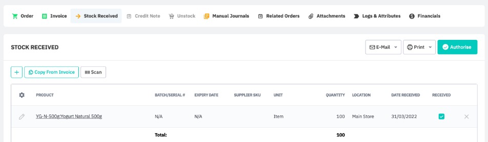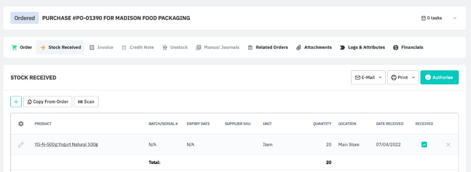 When the finished goods are received from the co-manufacturer, enter the Stock Received in the purchase order and authorize. Multiple stock received actions can be created for each purchase order. When stock received equals invoice quantity, the production run linked to that invoice will be completed. It is possible for one invoice to cover multiple stock received actions, or vice versa.