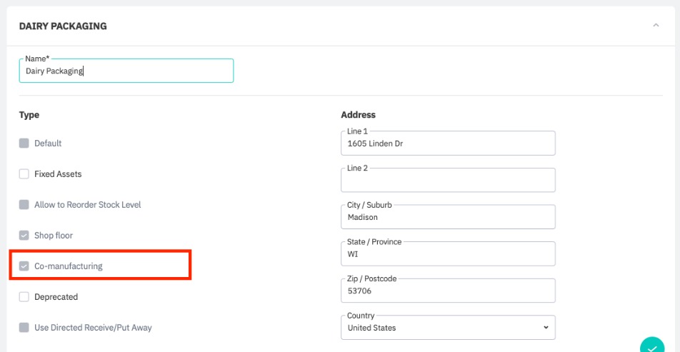 Here, you will specify if a work centre is a co-manufacturing location using checkboxes. There are two types of co-manufacturing location.