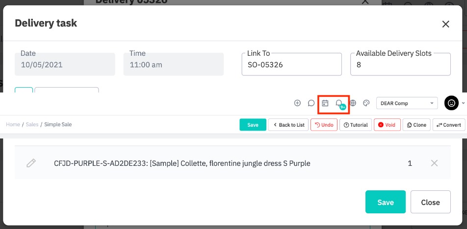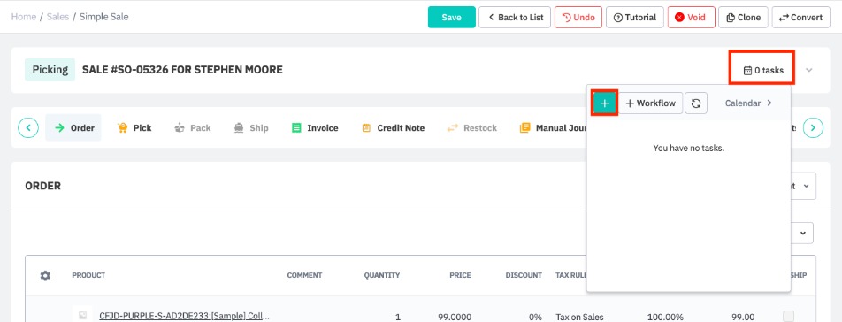 If the tasks module is enabled, the tasks icon to appear at the top-right of the order screen for most Cin7 Core processes. Use + to assign a delivery task.
