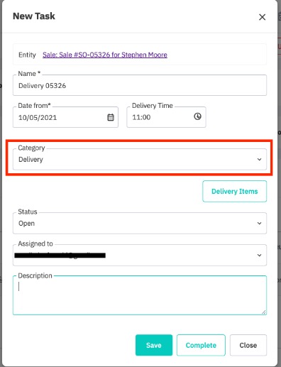 Enter a Name for the task and choose a date and time. Select Category: Delivery, and Save the task. You can now click Delivery Items to open the delivery window.