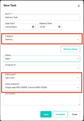 Enter a Name for the task and choose a date and time. Select Category: Delivery, Entity type: Sale order, select an Entity instance, and Save the task. You can now click Delivery Items to open the delivery window.