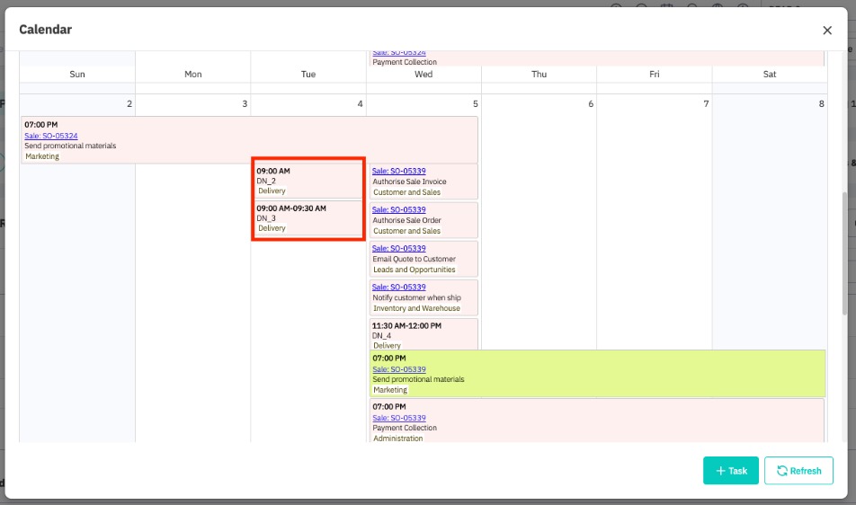 Delivery tasks are displayed on the task calendar with tasks relating to other items.
