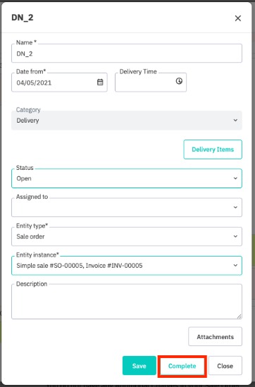Click on a task, via the Calendar, task icon on a sale, or via notifications window, to open it. Click Complete to mark the delivery as completed.