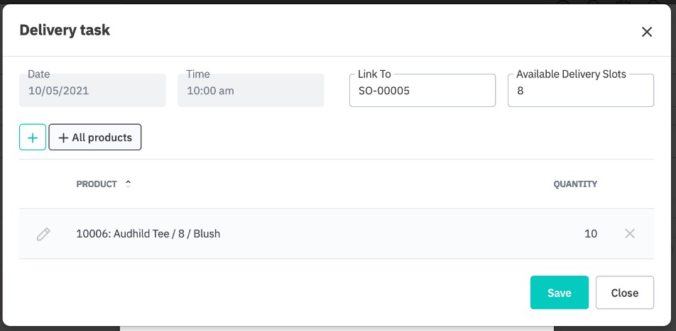 Click + to add products from the sale to the delivery task. You can only add as many items as are part of the sale. You will not be able to add a delivery task if there are no more available delivery slots for the day. Save and Close the window to return the task, and save the task to add it to the task calendar.