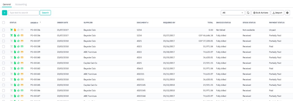 In General View, each purchase will have a series of icons (Order, Billing, Stock Receiving, Payment) listed to give you information about the purchase status. The order of the icons depends whether you have selected Stock First or Invoice First for your purchase process (Settings → General settings → Purchase process customisation).