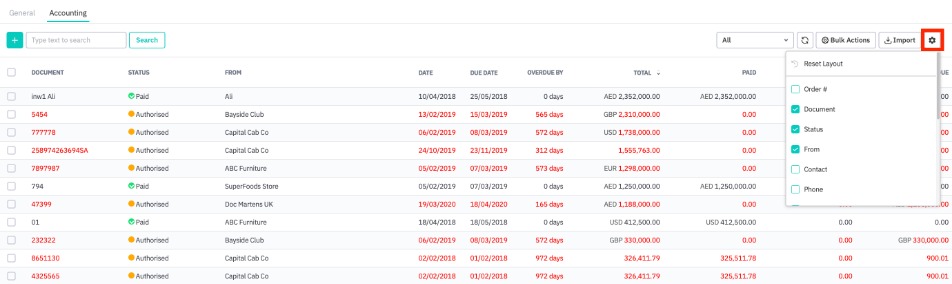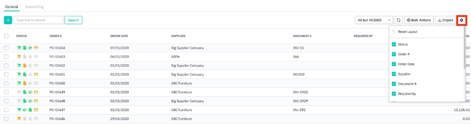 General view fields can be added or removed by using the settings icon in the top right. Enable/disable table columns by checking the appropriate box, or reset the table to the default layout by clicking Reset Layout. The terms invoices and bills are used interchangeably.