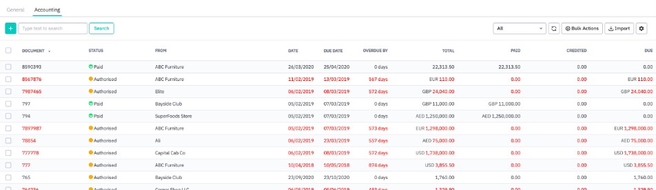 The Accounting View shows in detail the authorization and payment status of draft bills, bills, and credit notes. Filter the list by type of purchase (Overdue Bills, Awaiting Payment, All Credit Notes, etc). You can also import purchase tasks via CSV file from this page. Overdue payments are shown in red.