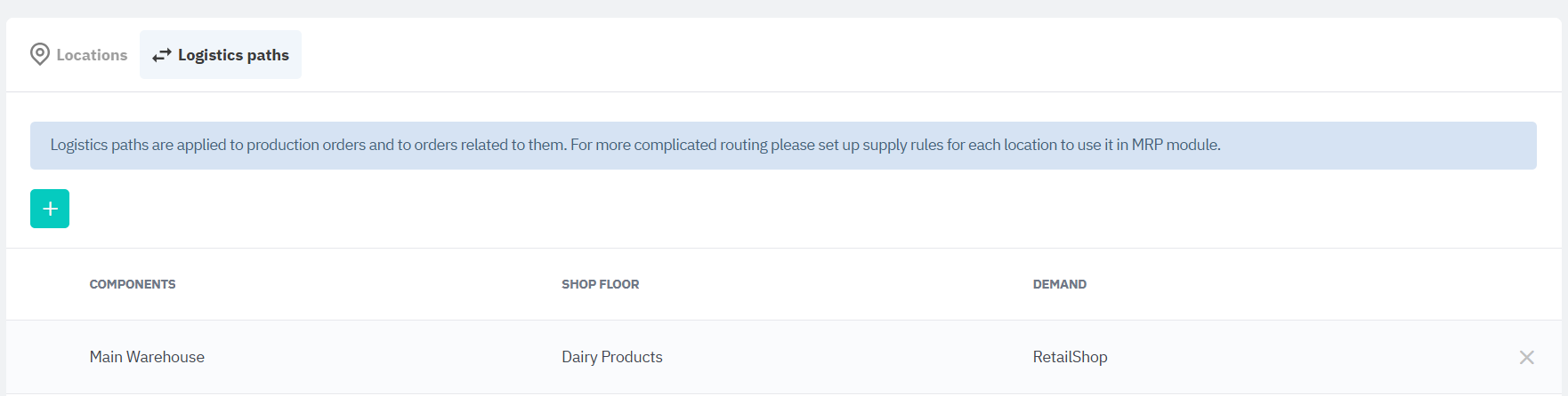 Select locations for each of the following fields. You can use the same location for multiple fields, or all fields. Each components or demand location can be connected to multiple shop floor locations. However, each shop floor location can only be connected to one warehouse.