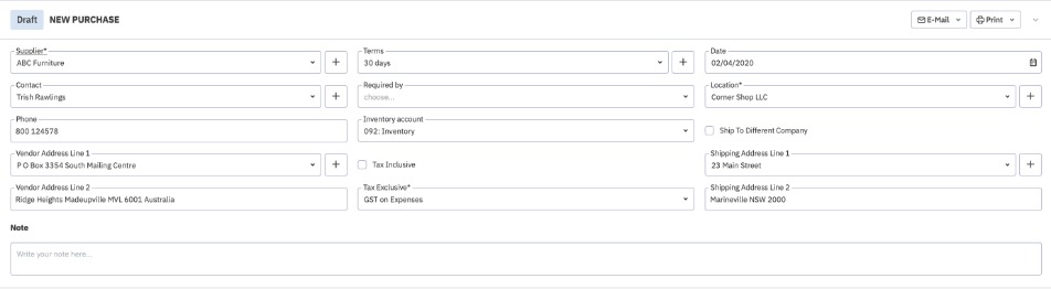 The first step in creating a new service purchase order is to fill in the fields of the document header. This will contain the supplier and address details.
