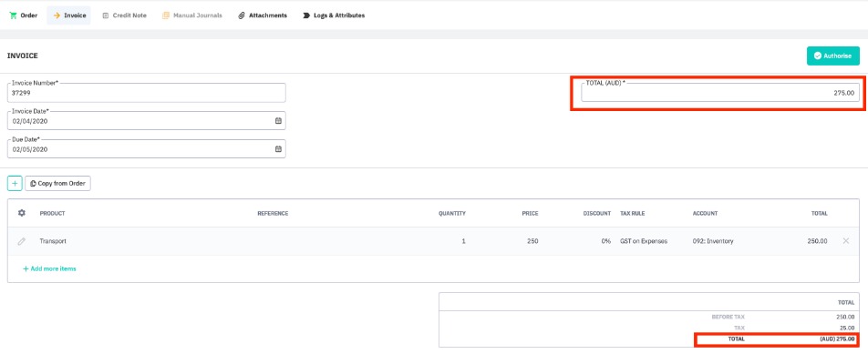 Add the invoice lines. You can copy the lines from the purchase order by clicking +Copy from Order or add items manually.