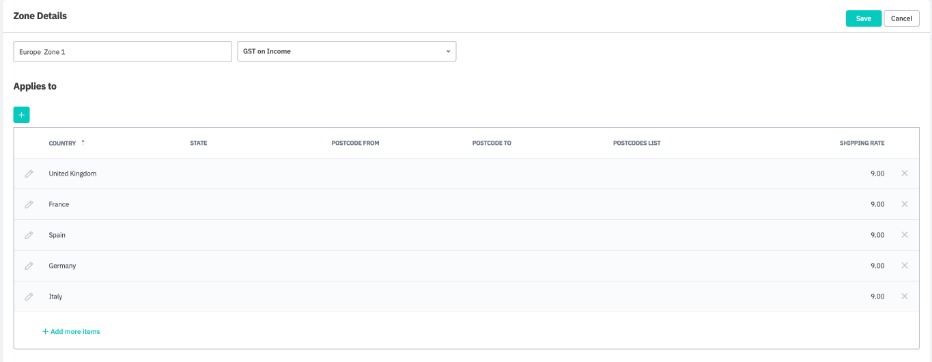 To add another country to the zone, click the Add more items link at the bottom of the table, then repeat Step 4. Otherwise, click Save to go back to the Shipping Zone page. You may also add more complex Price-based and Weight-based rates to the shipping zone at this time.