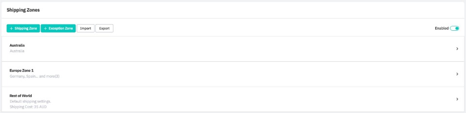 The regions and countries that you ship to are known as shipping zones. Each shipping zone includes shipping rates that apply to customers whose addresses are within that zone. Shipping zones are used to automatically calculate shipping rates for your customers. You can view your shipping zones by going to Settings → Reference books → Other Items → Shipping Zones.