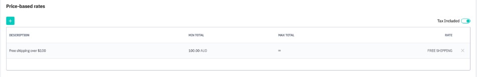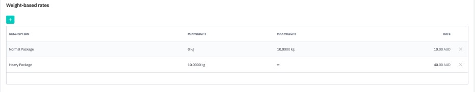 Click + under the Weight-based Rates section to add a new rate. Enter a description, then a minimum and/or maximum weight, whichever is applicable.
