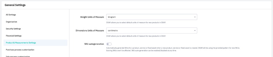 Note: Cin7 Core does not enforce certain weight units. To use weight-based criteria, check that the default weight units are correctly set. If weight units are set to another unit of measurement, it will be converted to the tenant default. To see or edit your organisation's default weight units, go to Settings → General settings → Product & Measurements Settings.