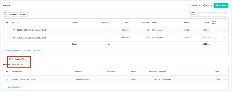 In the Additional Charges section, click Get Shipping Rates → Shipping Zones to calculate them automatically. You can edit the shipping rates manually if necessary.