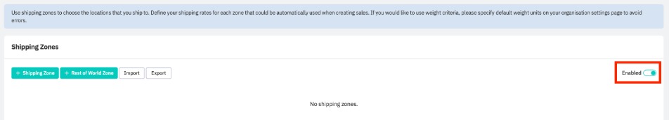 Shipping Zones must be enabled before they can be applied to orders. Go to Settings → Reference books → Other Items → Shipping Zones and slide the toggle to Enabled.