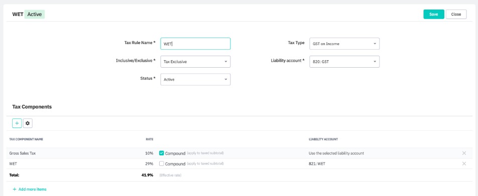 Example 2: Compound tax with multiple components. In Australia, those who make wine, import wine into Australia or sell it by wholesale, generally have to account for wine equalisation tax (WET). First, the WET of 29% is applied to the order total, then the GST of 10% is applied to the taxed subtotal. In this example, the user has created multiple liability accounts to keep each sales tax component organised.