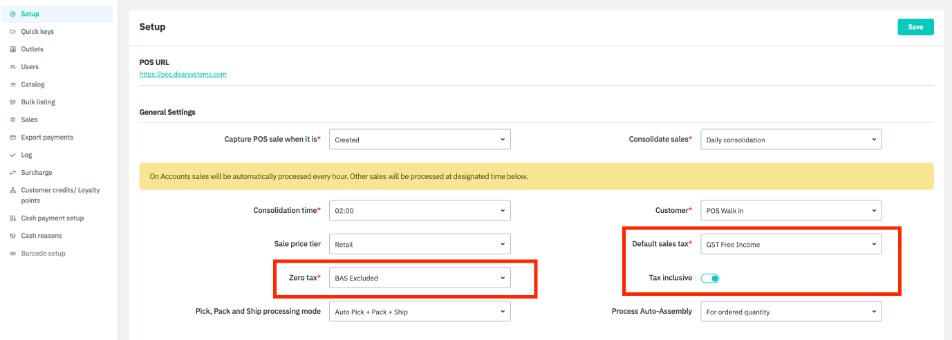 Default tax settings for each POS can be set in Integrations → POS → [POS Name] → Setup. You can choose a default sales tax, default tax-free rate and whether POS sales are tax inclusive or tax exclusive. You can choose different default tax settings for each of your POS points.