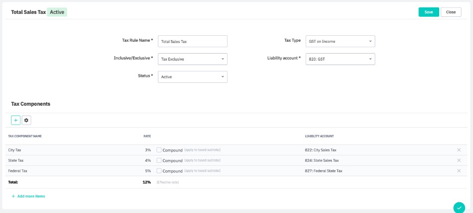 Example 1: Simple tax with multiple components. In this example, a transaction is subject to a multi-component sales tax (3% City Sales Tax, 4% State Sales Tax, 5% Federal Sales Tax). The total effective tax rate is 12%. In this example, the user has created multiple liability accounts to keep each sales tax component organised.