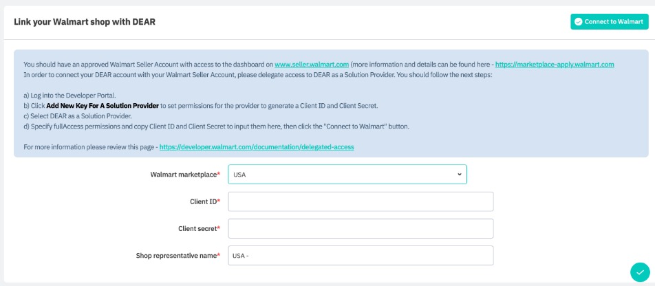 First, you must connect Cin7 Core to your Walmart Marketplace store. You must have an active Walmart Seller account to use this integration. You will need to generate a Client ID and Client Secret for Cin7 using delegated access authorization.