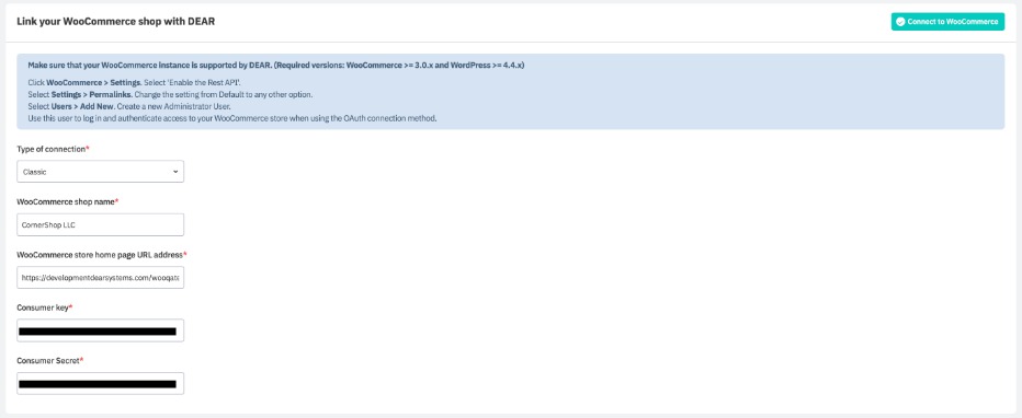 If you encounter any errors when integrating Cin7 Core to WooCommerce using OAuth, you can set up the connection using the Classic method instead, which involves generating an API key in WooCommerce, then using the key to connect WooCommerce to Cin7 Core.