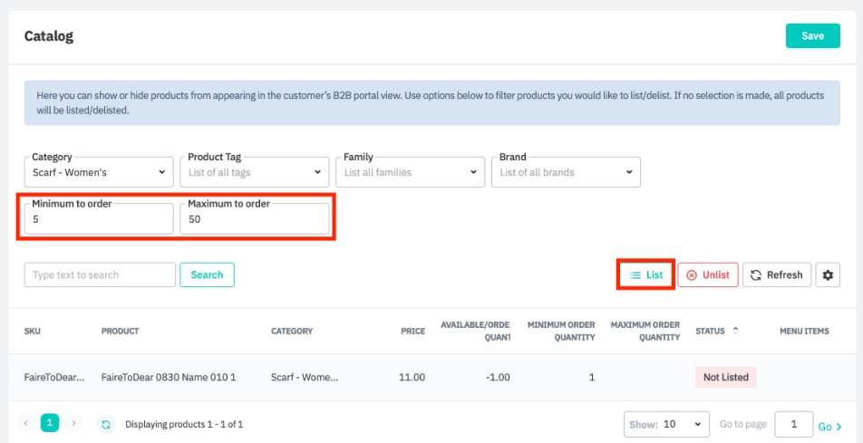 The Catalog page allows you to set a minimum and/or maximum order quantity when you list a product. Search or filter for the products to list with a minimum and/or maximum order quantity. Enter a number in the Minimum to Order field and Maximum to Order field and click List. Unlisted items will be listed with the minimum order quantity.