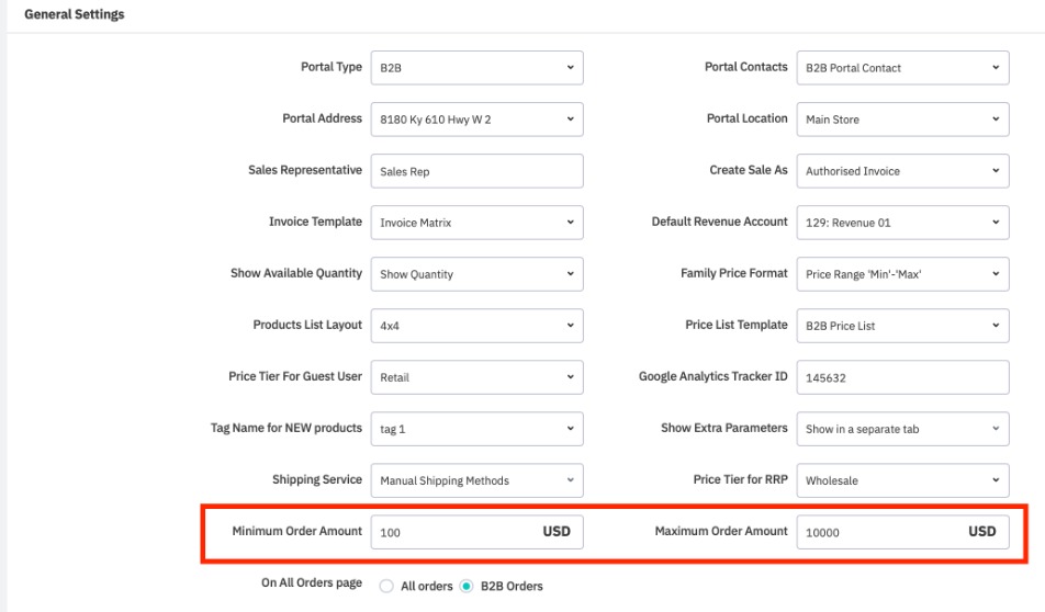 Maximum and minimum order amounts are set from the B2B Portal General Settings (Integrations → B2B Portal → General). This value is set in your organisation's base currency and will be converted to the B2B portal currency if the B2B portal currency is not the same.