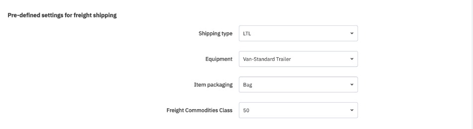 Pre-defined settings for freight shipping: Pre-defined settings for freight shipping are used to estimate shipping rates, which takes place at the quote or order stage of a sale. Real settings can be input when printing shipping labels during the pack and ship stage of the sale. Available setting values are imported from ShipRush.