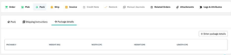 This sub-tab is for entering package dimensions for all packages within a sale order. Click Enter package details to open a pop-up window.