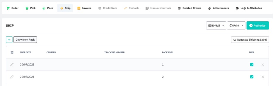 On the Ship tab, press Copy from Pack. Click Generate Shipping Label to send package information and shipping instructions to the shipping service provider and generate the shipping label and Authorize the ship tab.