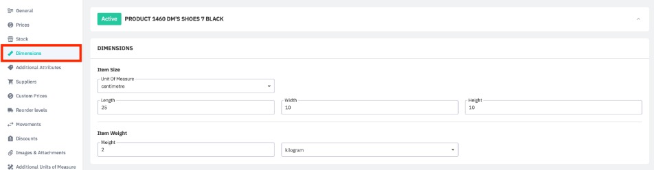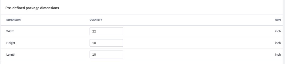 Pre-defined package dimensions:Pre-defined package dimensions are used to estimate shipping rates, which takes place at the quote or order stage of a sale. Real dimensions can be input when printing shipping labels during the pack and ship stage of the sale. The units of measure are taken fromGeneral settings → Products and measurements settings.
