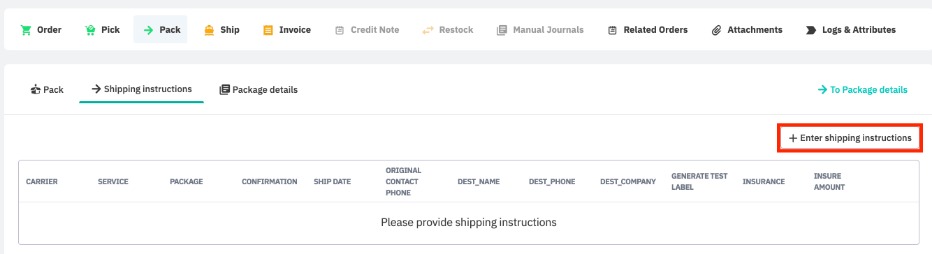 From here, click the Shipping Instructions sub-tab. This sub-tab is for shipping information that applies all packages. Click Enter Shipping instructions to open a pop-up window.