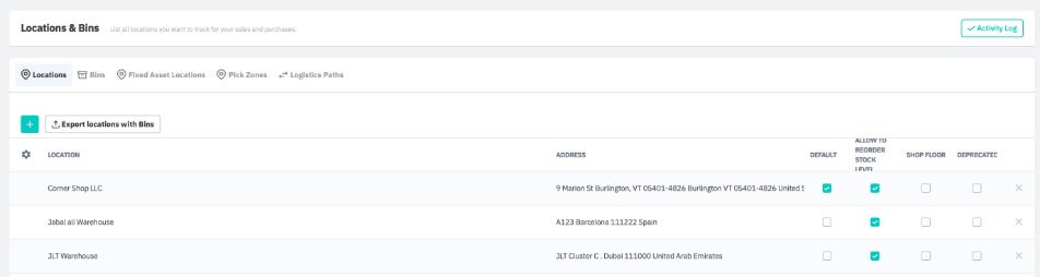 Go to Settings → Reference books → Stock → Locations & Bins.