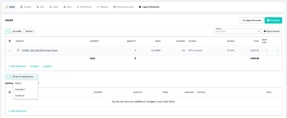 When this setting is enabled Cin7 Core obtains the shipping cost value from ShipStation and automatically creates and authorizes an invoice entry under the Additional Charges section of the invoice tab in Cin7 Core.