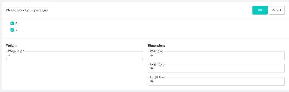 The pop up window is dynamically generated according to the connected shipping service. Select which boxes to include and enter the weight and dimensions. Save your changes.