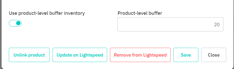 Displayed when Update Stock Levels in Lightspeed is enabled. Allows for an inventory buffer on stock quantities pushed to Lightspeed. Sync quantity passed to Lightspeed when updating stock levels will be equal to Actual Stock - Buffer Inventory. Enabling this setting will enable the Buffer Inventory field.