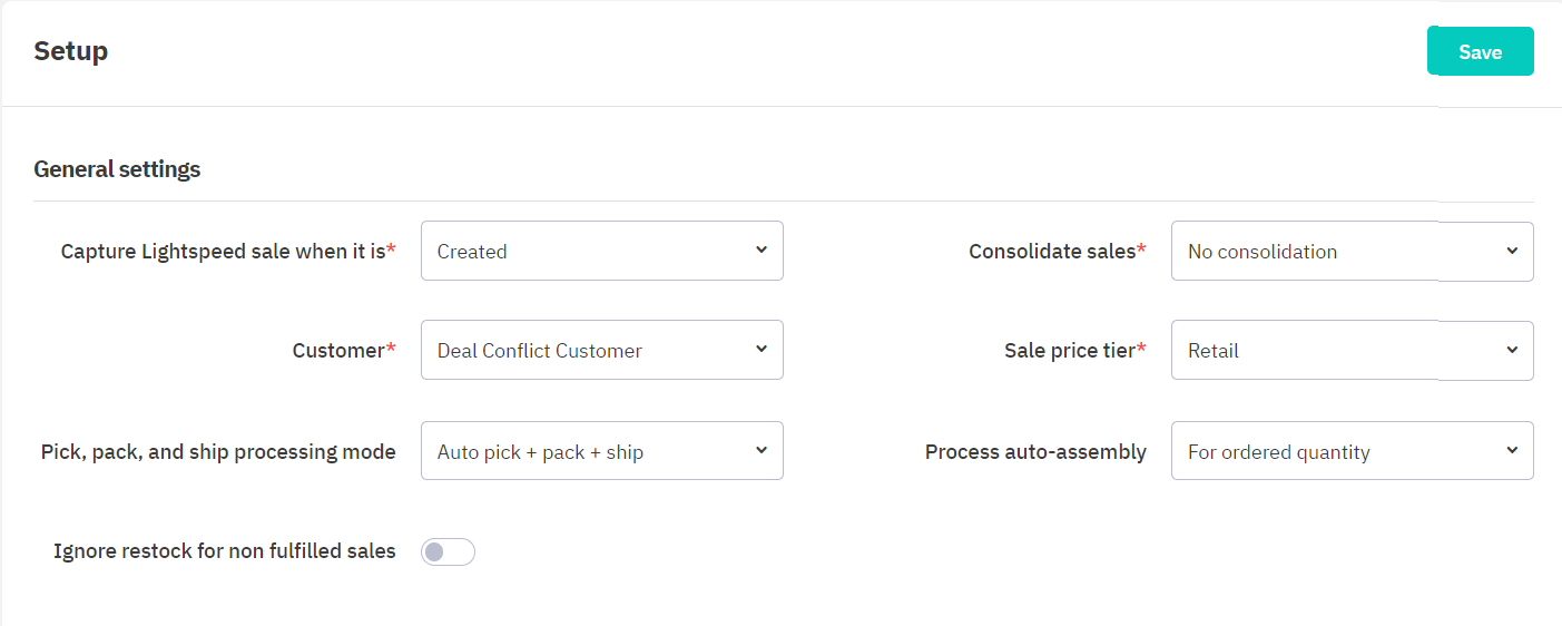 Once you've connected Cin7 Core to your Lightspeed account, you can then configure the integration settings between the two systems under the Setup tab on the Lightspeed Retail X-Series Integration page in Cin7 Core.