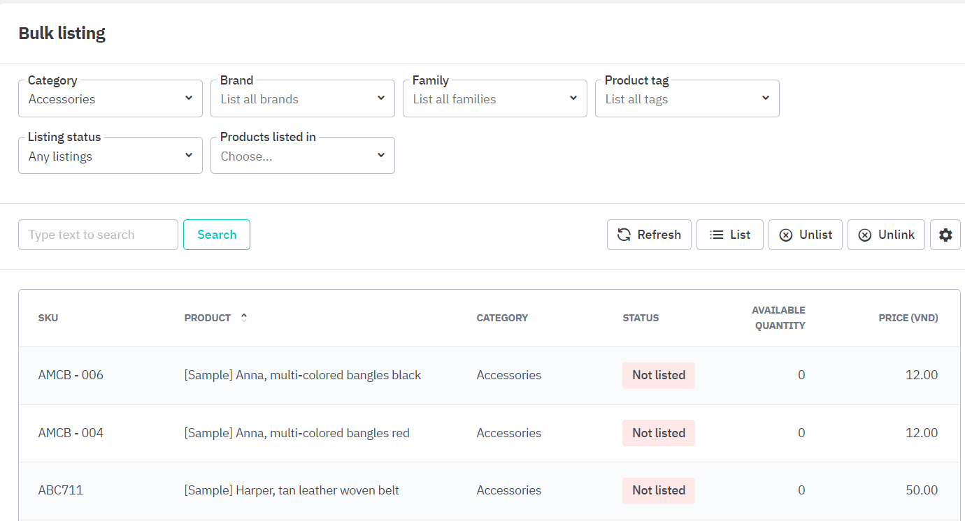 Select products to upload in bulk. You can select products by Category, Brand, Family, Product Tag, Listing Status, Products Listed in (another sales channel or store), and through manual search.