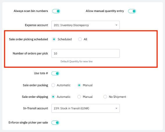 Set Sale order picking scheduled to Scheduled. This will immediately enable the Number of Orders per Pick setting.