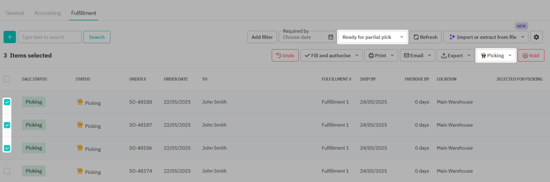 Select Picking → Schedule for Picking. This will make these orders available for picking in the WMS app. The date and time that the order was made available for picking will now be displayed in the Selected for Picking column.