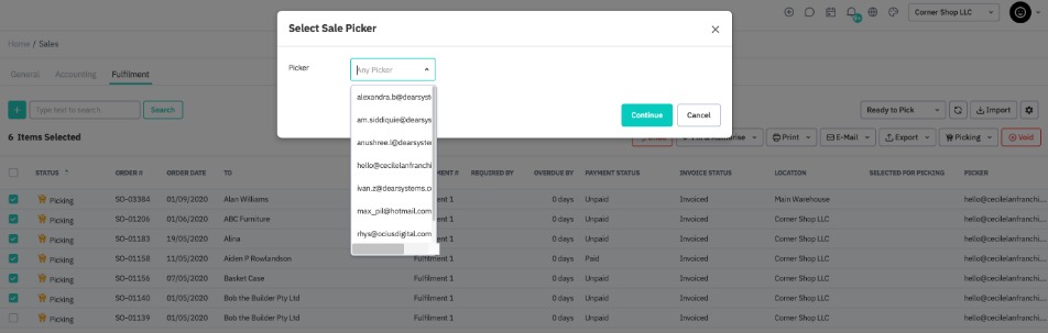 Once sale order picking has been enabled, you can set a picker from your registered users. This feature will only be available if you have selected scheduled picking in the WMS settings. Setting a picker is independent of scheduling an order for picking - clearing the picking schedule will not remove a set picker.
